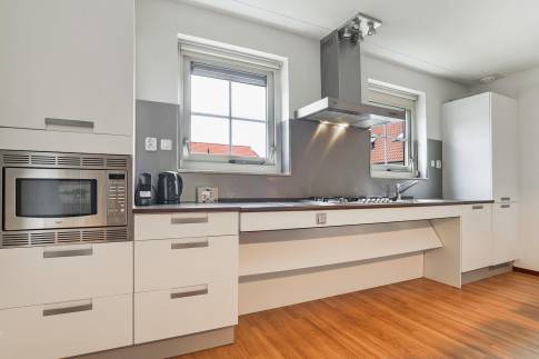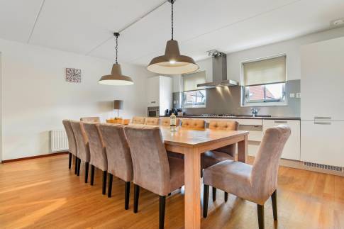 Begane grond: vanuit de hal heeft u toegang tot de grote woonkamer met openslaande deuren naar een betegeld terras. De keuken is voorzien van een in hoogte verstelbaar aanrechtblad en beschikt o.a. over een grote koelkast, vrieskast (3 lades), 6 pits kookplaat, combimagnetron, vaatwasser en afzuigkap. Vanuit de woonkamer heeft u toegang tot een extra toegankelijke badkamer en 2 slaapkamers. De slaapkamers zijn voorzien van een hoog/laag bed. Het toilet is separaat.