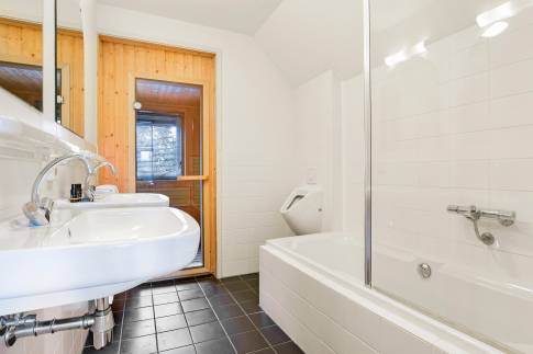 1e verdieping: deze verdieping bestaat uit 4 ruime 2 persoons slaapkamers. Daarnaast is er een betegelde 2e badkamer met bubbelbad, wastafel en een separaat toilet. De 3e badkamer is voorzien van een dubbelde wastafel, douchecabine en toilet. Daarnaast is hier ook de entree naar de sauna.