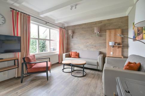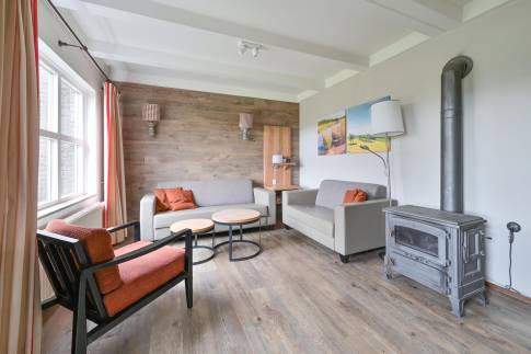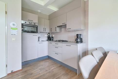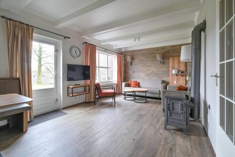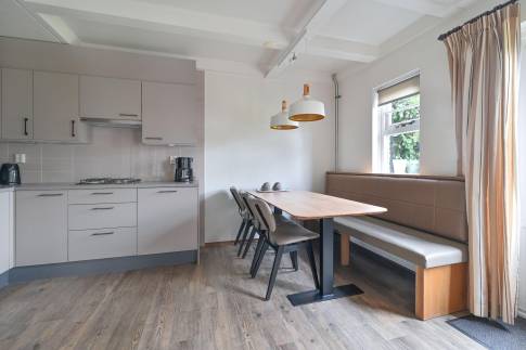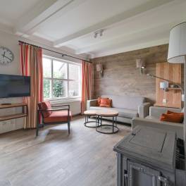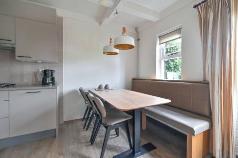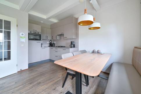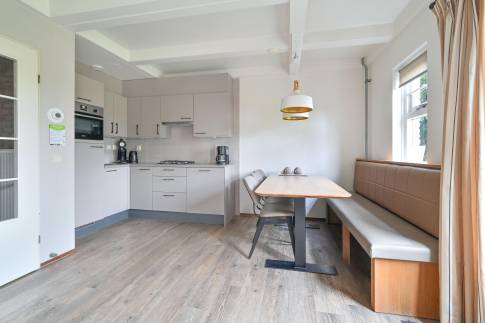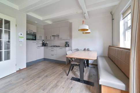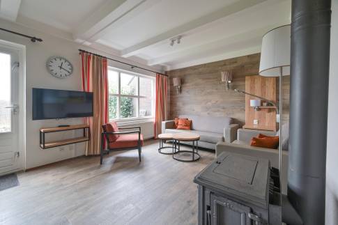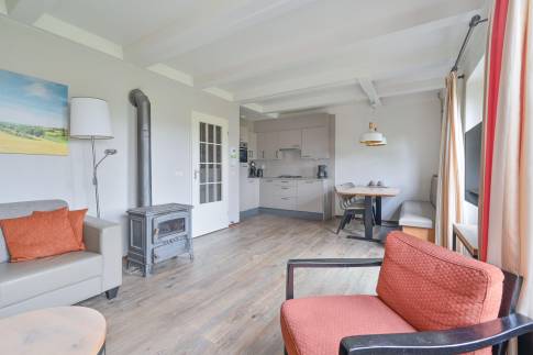 De woonkamer beschikt over een gezellige zithoek met houtkachel, flatscreen-tv en eethoek, en sluit direct aan op het gemeubileerde terras met verstelbaar tuinmeubilair en parasol. De open keuken is volledig ingericht en voorzien van onder andere een vaatwasser, combimagnetron, koelkast met vriesvak, waterkoker en zowel een Senseo- als filterkoffiezetapparaat.