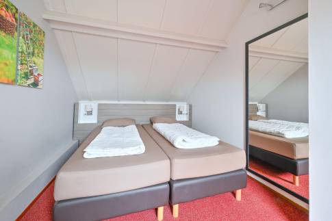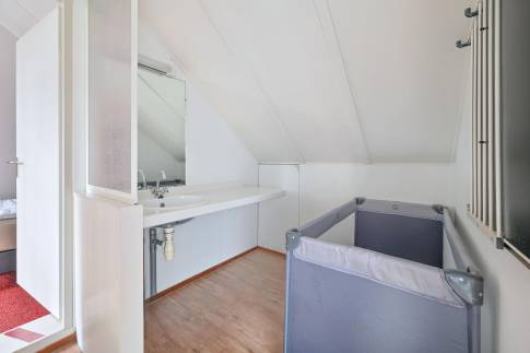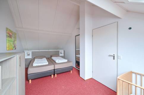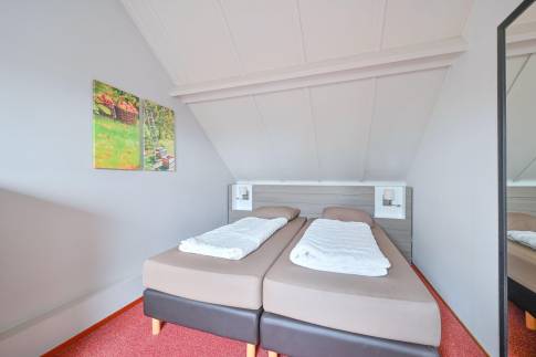 Op de begane grond bevindt zich een slaapkamer met twee eenpersoons boxsprings, evenals de badkamer met bad en wastafel en een separaat toilet. Op de eerste verdieping liggen nog twee slaapkamers, elk ingericht met twee eenpersoons boxsprings. Daarnaast is er boven een extra wastafel aanwezig. De woning is rookvrij en ligt in een autovrij park, waarbij parkeren mogelijk is op de centrale parkeerplaats. Afhankelijk van de uitvoering zijn huisdieren in enkele accommodaties toegestaan en kan een voorkeur voor een mooi uitzicht worden opgegeven.
