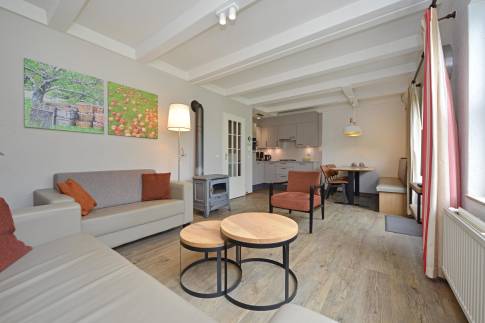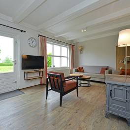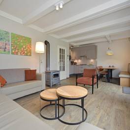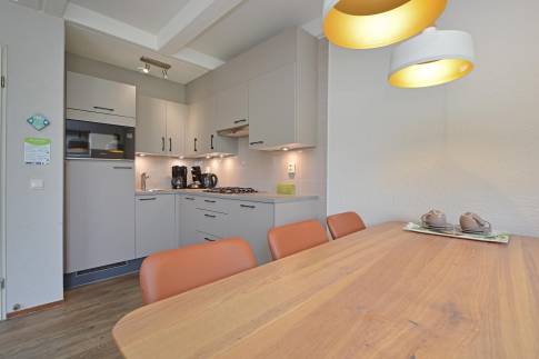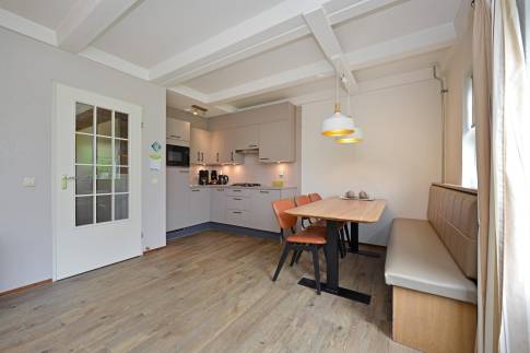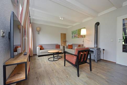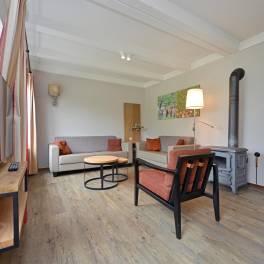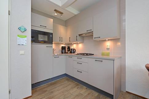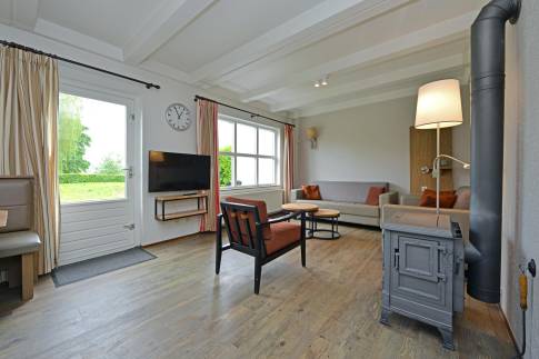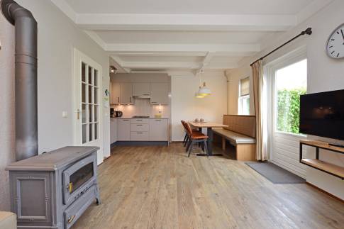 Deze 6-persoons 2-onder-1-kap woning ligt op een rustige, zonnige plek op het park. De modern ingerichte woonkamer heeft een sfeervolle houtkachel. Vanuit de woonkamer heeft u direct toegang tot het terras met comfortabel tuinmeubilair. De open keuken is voorzien van inbouwapparatuur en diverse andere moderne gemakken. U vindt er bijvoorbeeld een vaatwasser, magnetron, koelkast met vriesvak, Senseo- en filterkoffiezetapparaat. In de woning zijn drie slaapkamers elk voorzien van twee eenpersoons boxspringbedden. Eén van de slaapkamers is gesitueerd op de benedenverdieping, waarvan het bed tevens is voorzien van een 2-persoons softtopper. De badkamer met ligbad met douchekop en een wastafel ligt ook op de benedenverdieping. Het toilet is separaat. Op de verdieping vindt u een handige extra ruimte met wastafel.