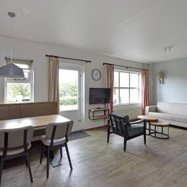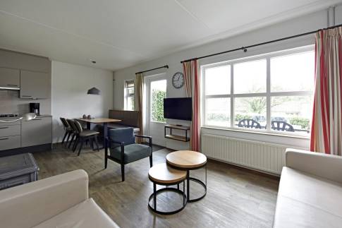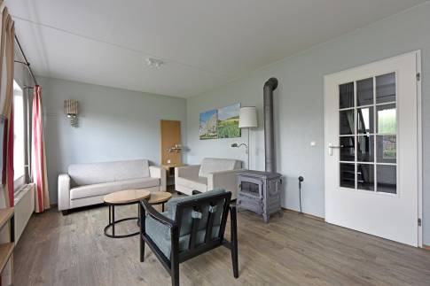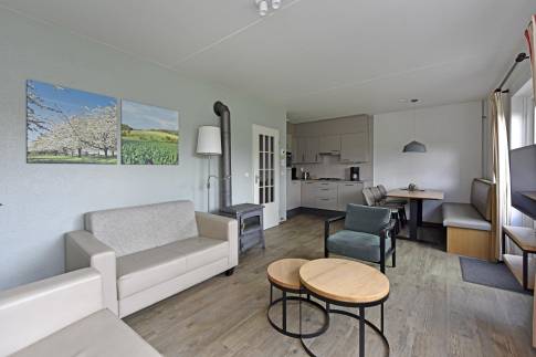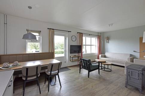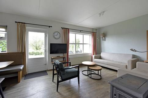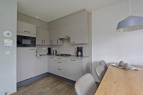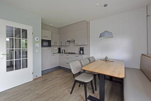 Deze comfortabele 6-persoons tussenwoning van het type 6C2 bevindt zich op een zonnige locatie in het park. De sfeervol ingerichte woonkamer heeft een moderne uitstraling en is uitgerust met een gezellige houtkachel. Via de woonkamer bereikt u direct het terras met tuinmeubilair, waar u kunt genieten van het buitenleven. De open keuken is compleet ingericht en voorzien van diverse inbouwapparatuur, waaronder een vaatwasser, magnetron, koelkast met vriesvak en een Senseo koffiezetapparaat. In de woning zijn drie slaapkamers, elk met twee eenpersoons boxspringbedden. Eén slaapkamer bevindt zich op de begane grond, net als de badkamer met douche en wastafelmeubel en een apart toilet. Daarnaast is er een inpandige berging aanwezig. Op de eerste verdieping zijn de twee overige slaapkamers gesitueerd, samen met een ruimte met douche en wastafel.
