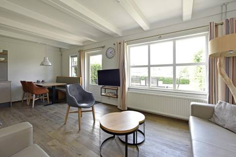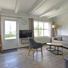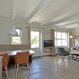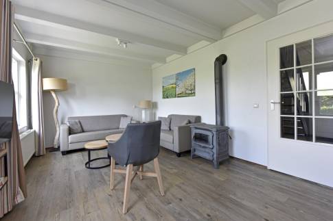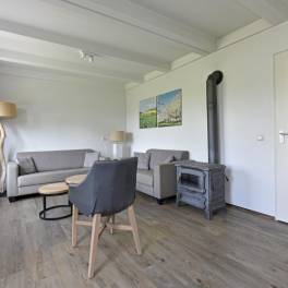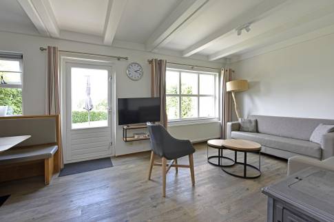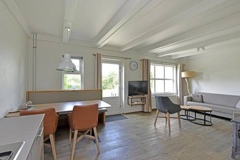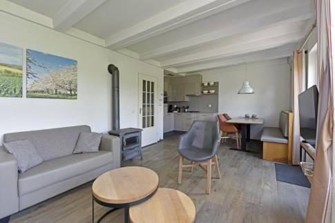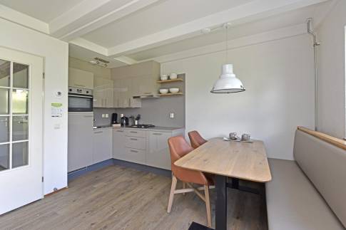 Deze ruime 4-persoons hoekwoning (type 4CE1) beschikt over een gezellige woonkamer met flatscreentelevisie en houtkachel. Vanuit de woonkamer loopt u direct het gemeubileerde terras op. De open keuken is compleet uitgerust met een vaatwasser, combimagnetron, koelkast met vriesvak, en een Nespresso koffiemachine.
