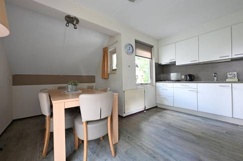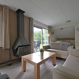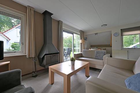 Deze vrijstaande recreatiewoning staat op een perceel eigen grond van 570 m². De lichte woonkamer met zit- en eethoek heeft een sfeervolle open haard en via de schuifpui stap je zo het ruime gemeubileerde terras op. De open keuken is uitgerust met diverse inbouwapparatuur, waaronder een vaatwasser en een combimagnetron.