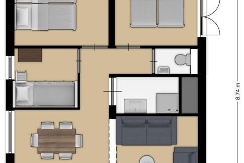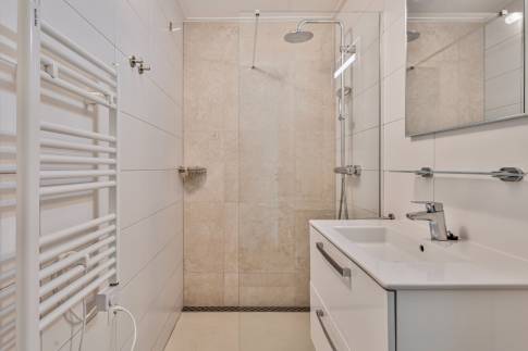 Er zijn drie slaapkamers, een badkamer met inloopdouche en wastafel, en een apart toilet. De volledige inventaris is in de prijs inbegrepen.