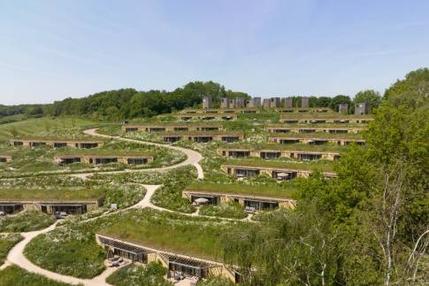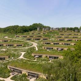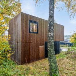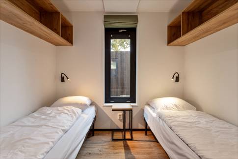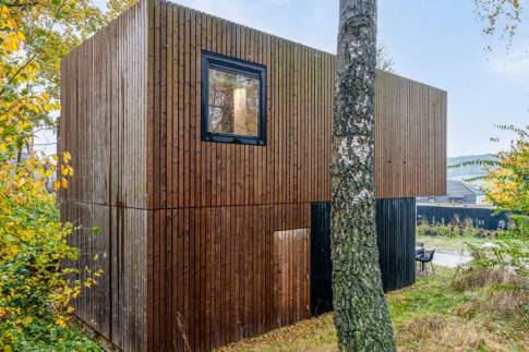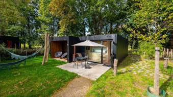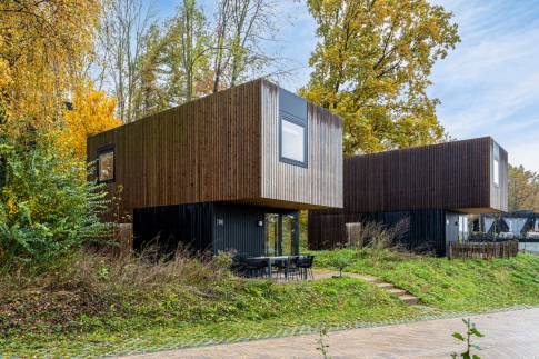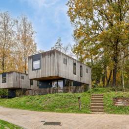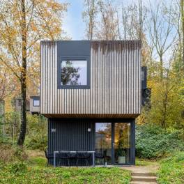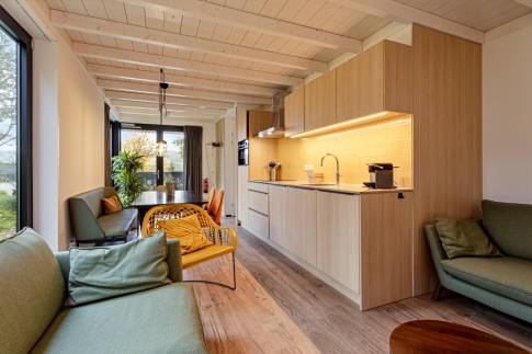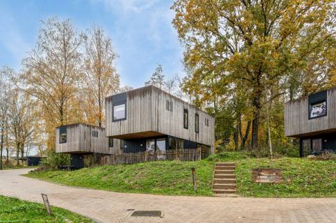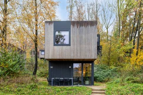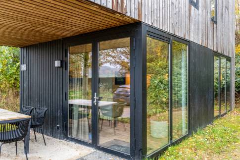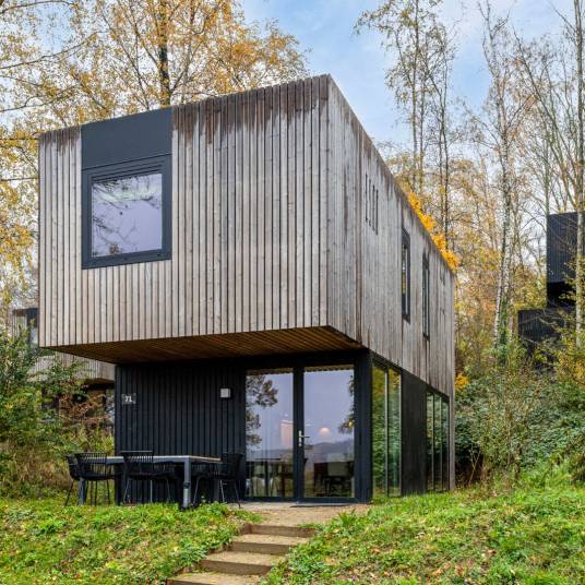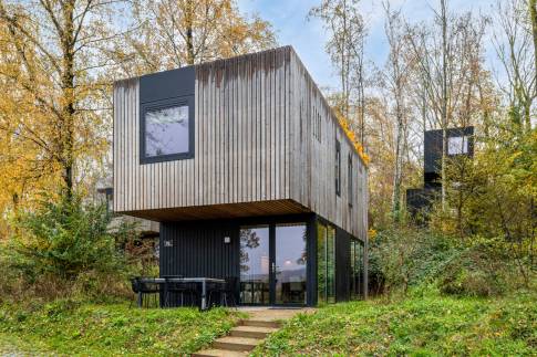 Dit vakantieverblijf voor zes personen heeft dankzij de combinatie van licht en donker hout een moderne en speelse uitstraling. Dankzij de grote ramen komt er veel natuurlijk licht binnen en kunt u optimaal genieten van de natuur.