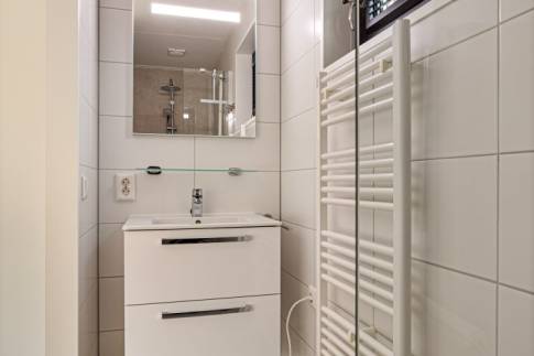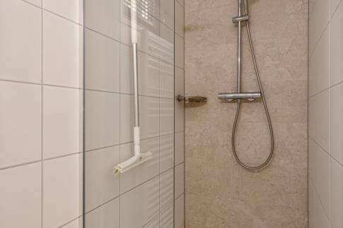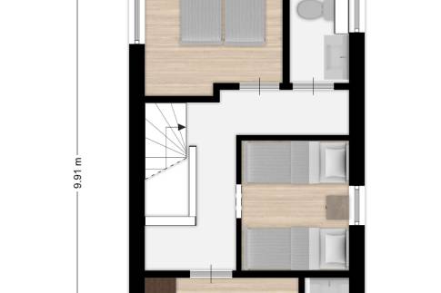 De eerste verdieping bestaat uit drie slaapkamers, waarvan één met badkamer ensuite met inloopdouche en wastafel. De tweede badkamer, ook met inloopdouche en wastafel, is bereikbaar via de overloop. Ook vindt u hier een apart toilet.