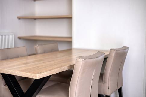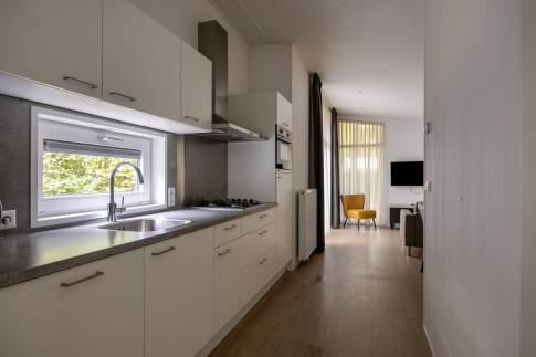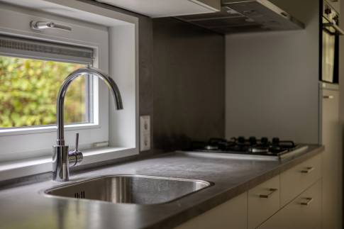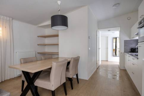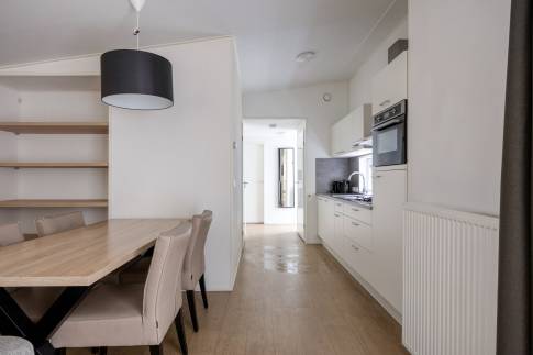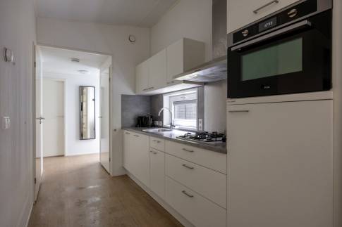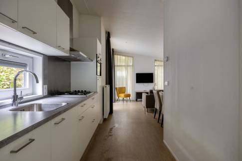 De open keuken is compleet ingericht en uitgerust met onder andere een koelkast met vriesvak, koffiecupapparaat, combimagnetron en vaatwasser – alles wat je nodig hebt om samen te koken en te genieten.