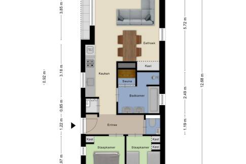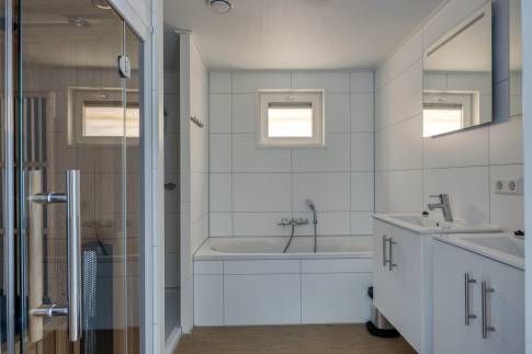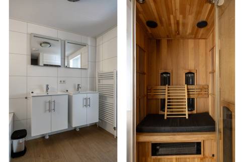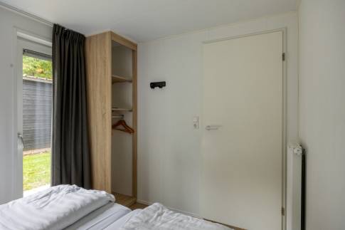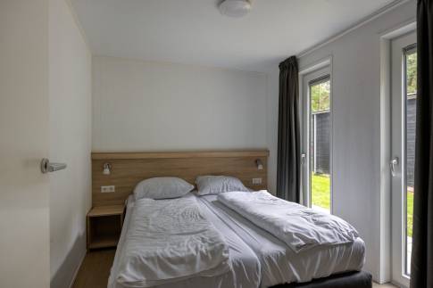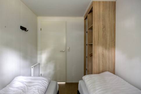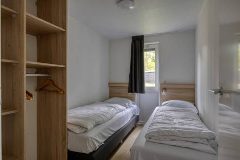 De lodge beschikt over 2 slaapkamers met in totaal 4 eenpersoonsbedden, waardoor iedereen van een goede nachtrust kan genieten. De badkamer is een ware wellnessruimte met een inloopdouche, ligbad en een infraroodsauna – ideaal voor ontspanning na een dag in de buitenlucht. Daarnaast is er een apart toilet aanwezig voor extra comfort.