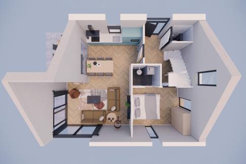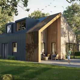 De 6-persoons recreatiewoning is ontworpen voor een groot gezin, vriendengroep of bijvoorbeeld een gezin met een opa en oma. Bij binnenkomst valt direct de ruime vide op, die bijdraagt een de beleving van luxe. De houten lamellen boven het terras zorgen voor een aangename schaduwwerking en dragen tevens bij aan de vormgeving van de woning. De grote raampartij met schuifpui zorgen voor een optimale lichtinval.