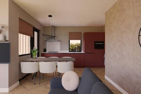 De ruime open keuken en woonkamer met schuifpui naar buiten bieden comfort en een mooi uitzicht op de natuur. De ruime slaapkamer op de begane grond heeft een aangrenzende badkamer. De slaapkamers op de verdieping hebben royale dakkapellen, die zorgen voor veel lichtinval en de ruimtelijke ervaring versterken.