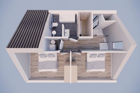 De ruime open keuken en woonkamer met schuifpui naar buiten bieden comfort en een mooi uitzicht op de natuur. De ruime slaapkamer op de begane grond heeft een aangrenzende badkamer. De slaapkamers op de verdieping hebben royale dakkapellen, die zorgen voor veel lichtinval en de ruimtelijke ervaring versterken. De royale badkamer boven is in de Luxe versie uitgevoerd met een douche, een ligbad en een inpandige sauna.