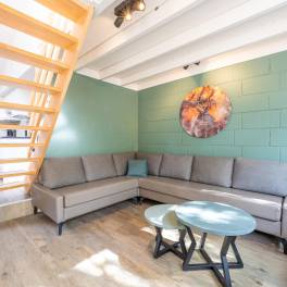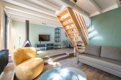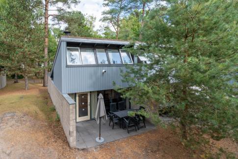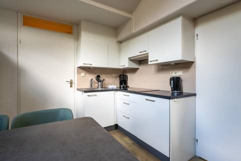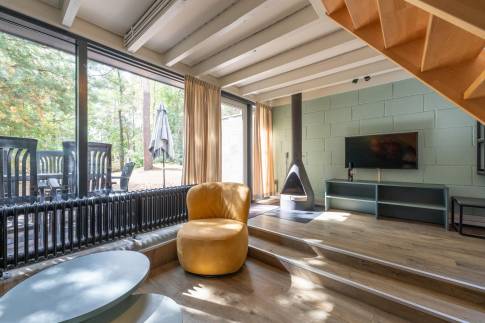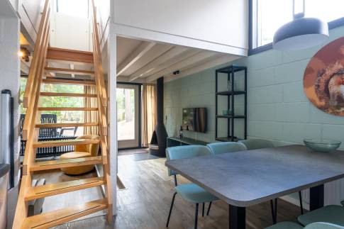 Deze comfortabele 6-persoons hoekbungalow, type 6B1, ligt centraal in het park, dicht bij alle faciliteiten. De woonkamer heeft een gezellige zit- en eethoek en een sfeervolle open haard. De open keuken is compleet uitgerust met inbouwapparatuur, waaronder een vaatwasser, magnetron en inductiekookplaat.