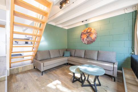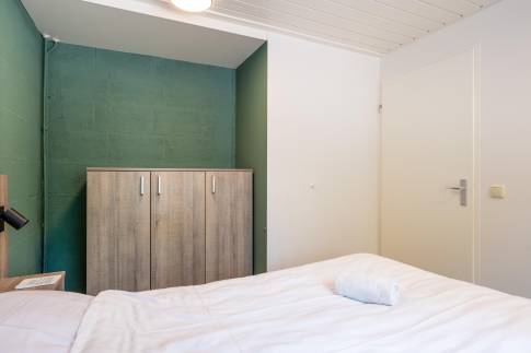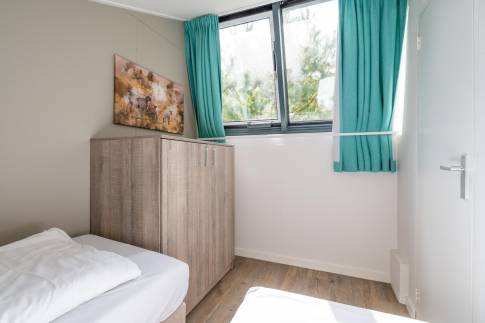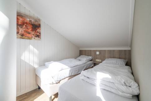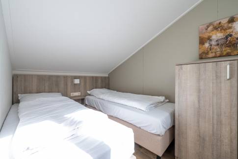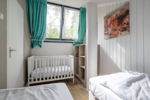 Vanuit de woonkamer stap je direct het zonnige terras op. Op de begane grond is een slaapkamer met een tweepersoonsbed. Hier bevindt zich ook de badkamer met inloopdouche en wastafel, en daarnaast is er een apart toilet. Via de trap in de woonkamer bereik je de eerste verdieping, waar zich twee slaapkamers met aparte bedden bevinden. Voor de allerkleinsten is er een ledikantje aanwezig.