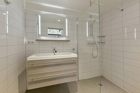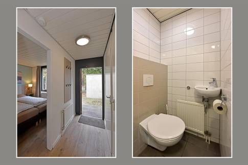 Op de begane grond is 1 van de 3 slaapkamers te vinden, deze is ingericht met twee 1-persoonsboxsprings. Ook de badkamer is op de begane grond te vinden. Deze beschikt over een douche en wastafelmeubel. In de hal is een separaat toilet aanwezig.