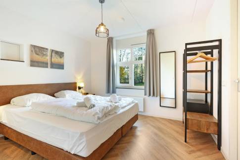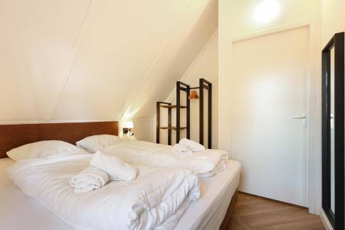 Recreatiewoning 105 (type 10L) is een luxe vrijstaande woning gelegen op een perceel eigen grond van 331 m2. De woonkamer beschikt over een royale zithoek met sfeervolle houtkachel. De open keuken met eethoek is van alle gemakken voorzien en beschikt over verschillende (inbouw)apparatuur zoals o.a. een broodrooster, combi-magnetron, oven, waterkoker, vaatwasser, koelkast met aparte vriezer, 6-pits gaskookplaat, en een Nespresso- en filterkoffiezetapparaat. Via de schuifpui heeft u toegang tot het deels overdekte en gemeubileerde terras. Op de begane grond is een slaapkamer en suite te vinden. De slaapkamer is ingericht met twee 1-persoons boxsprings met softtopper en LED flatscreen-tv. De en suite badkamer is voorzien van een douche/sunshower, toilet en wastafel. In de hal is een separaat toilet aanwezig.