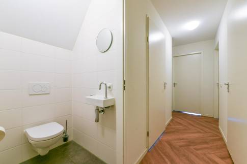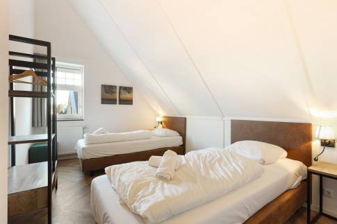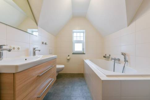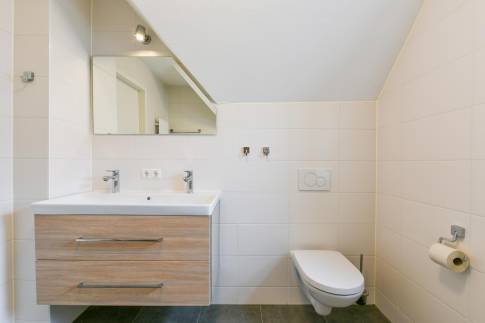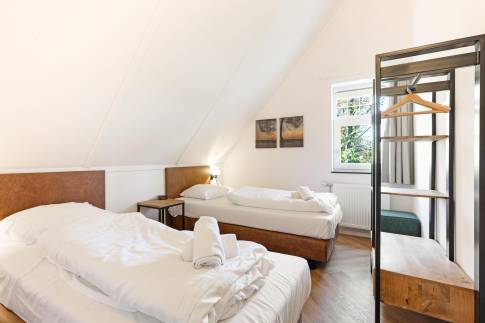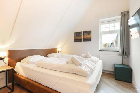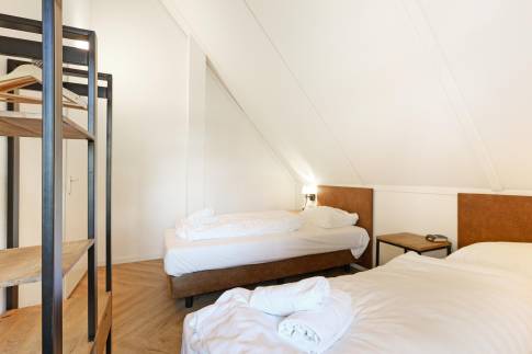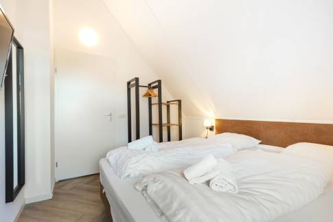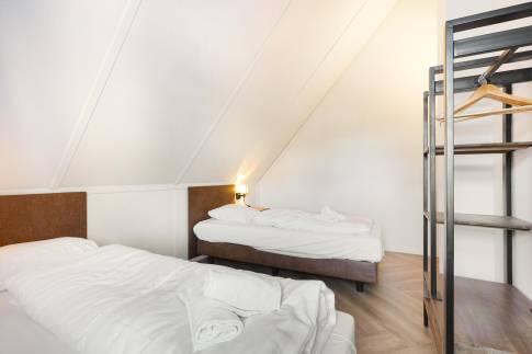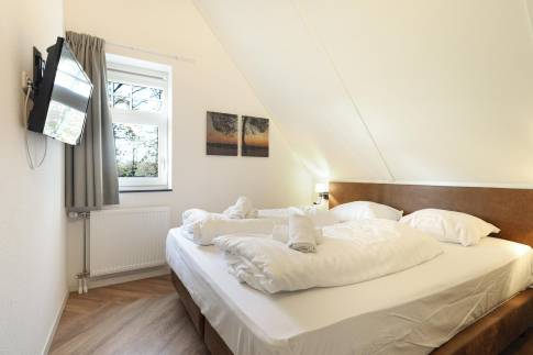 Op de eerste verdieping zijn de overige 4 slaapkamers te vinden. Twee slaapkamers zijn ingericht met twee 1-persoons boxsprings met softtopper en LED flatscreen-tv. De andere twee slaapkamers zijn ingericht met twee 1-persoons boxsprings. Ook zijn hier nog twee badkamers te vinden. De eerste is voorzien van een ligbad, toilet en wastafel. De tweede is voorzien van een sauna, douche en wastafel.
