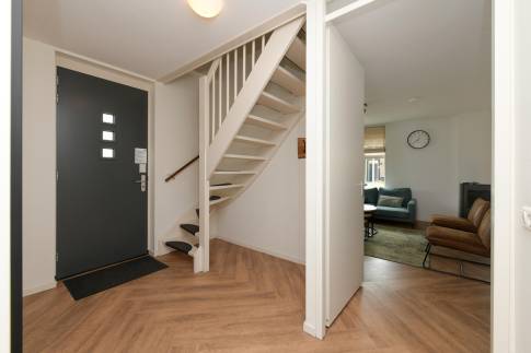 Het deels overdekte terras is via de schuifpui te bereiken. Het terras is voorzien van verstelbaar terrasmeubilair en een parasol. In de woning zijn drie slaapkamers aanwezig, waarvan één op de begane grond. Deze is voorzien van een en suite badkamer met inloopdouche met sunshower en wastafel. In de hal is een separaat toilet aanwezig. De inpandige bergruimte is via de buitenzijde te bereiken. De trap in de hal biedt toegang tot de verdieping. Hier zijn de overige twee slaapkamers te vinden. Ook is er een tweede badkamer aanwezig op de verdieping. Hier vindt u een ligbad, inloopdouche, wastafel en sauna.