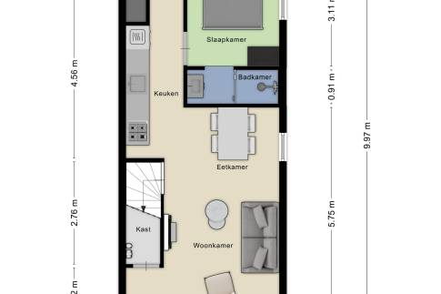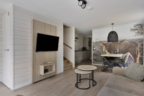 De woning is geschikt voor 4 personen en biedt een doordachte en comfortabele indeling. De lichte woonkamer is voorzien van grote raampartijen, vloerverwarming en een gezellige zithoek met uitzicht op de tuin. De open keuken sluit hier naadloos op aan en is uitgerust met moderne inbouwapparatuur, waaronder een vaatwasser en combimagnetron.