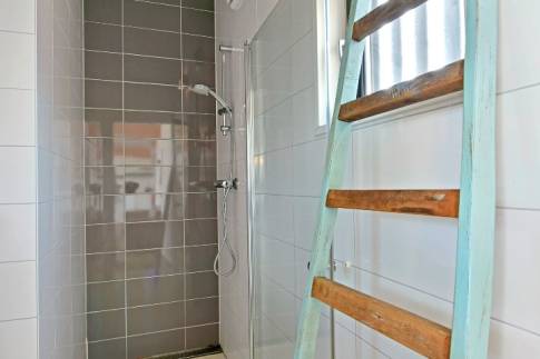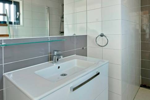 De badkamer heeft een inloopdouche en een wastafel. Het toilet is seperaat gesitueerd in de woning.