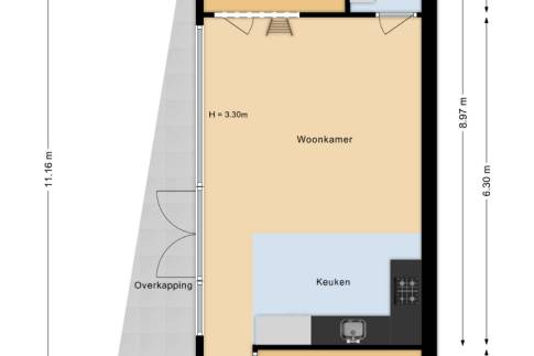 Deze vrijstaande woning heeft een woonkamer met veel lichtinval en een open keuken. De keuken is voorzien van onder andere een combimagnetron, koelkast met vriesgedeelte en vaatwasmachine.