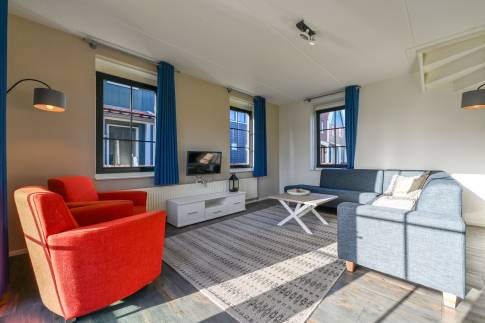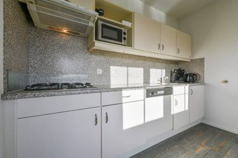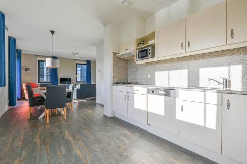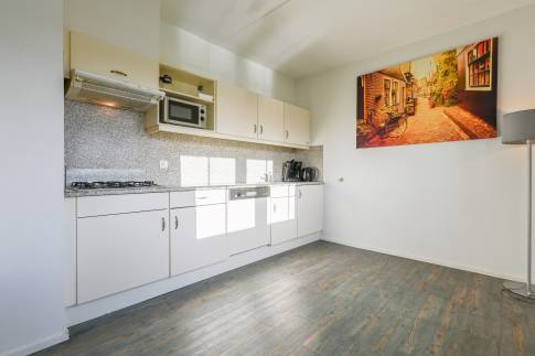De woning heeft een brede, sfeervolle woonkamer met openslaande terrasdeuren en een open keuken met onder andere een koelkast met vriesvak, magnetron en vaatwasser.
