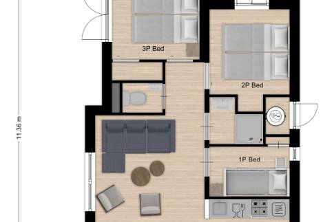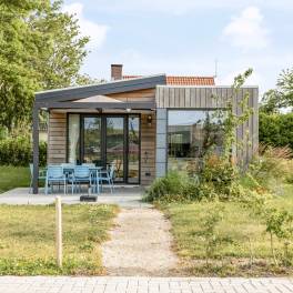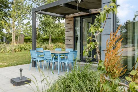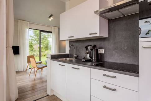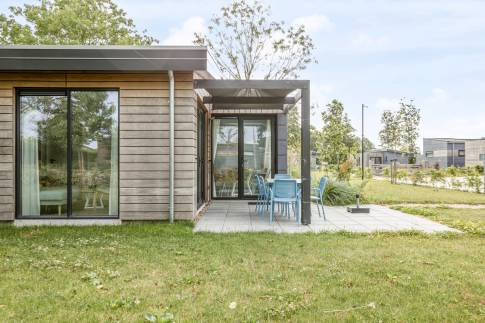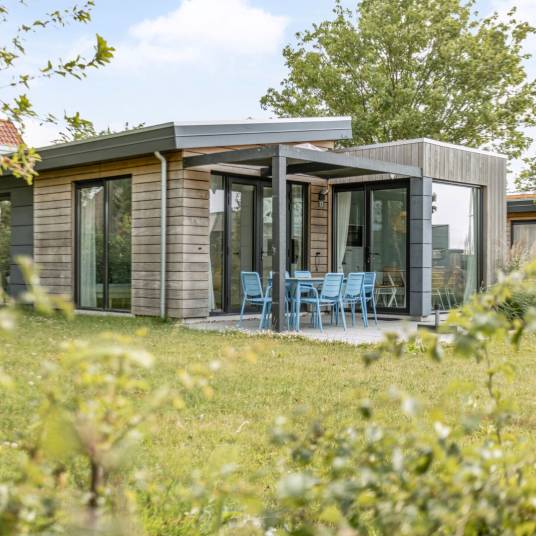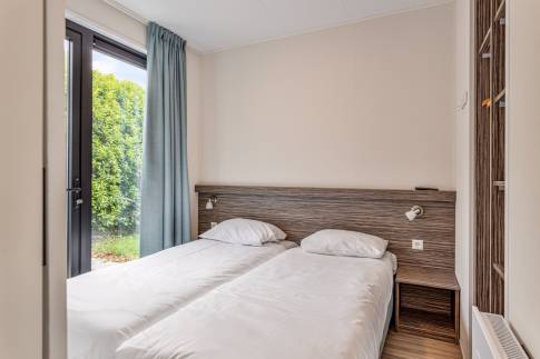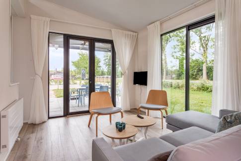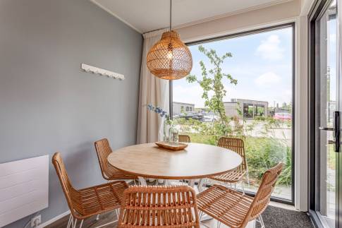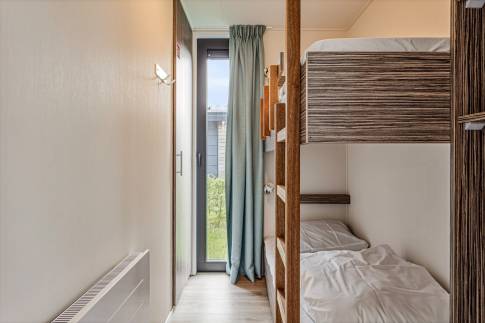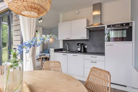 De indeling van deze 6-persoons woning bestaat uit een woonkamer met openslaande deuren, inbouwkeuken met inductie kookplaat, afzuigkap, koelkast, vaatwasmachine en combi magnetron, 3 slaapkamers waarvan er één is uitgerust met een eigen badkamer.