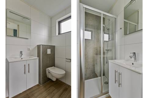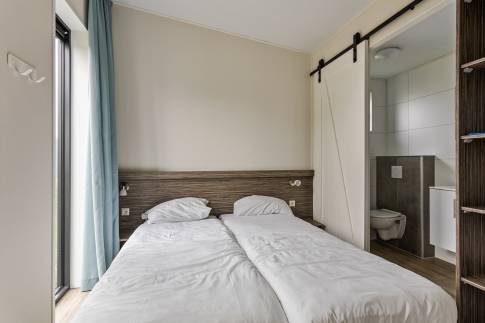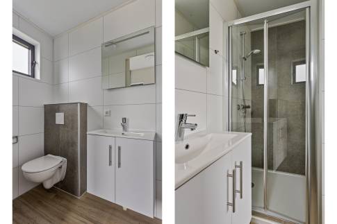 De woning beschikt over twee slaapkamers, elk met een eigen en-suite badkamer. Deze badkamers zijn stijlvol afgewerkt en voorzien van een inloopdouche, wastafel met meubel en toilet, wat zorgt voor optimale privacy voor u en uw gasten.