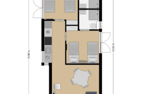 De entree bevindt zich in de lichte woonkamer, die dankzij twee openslaande deuren direct in verbinding staat met de buitenruimte. De ruime keuken is compleet ingericht met een inductiekookplaat, afzuigkap, combimagnetron, vaatwasser en koel-vriescombinatie.