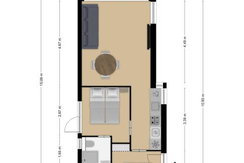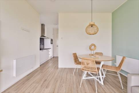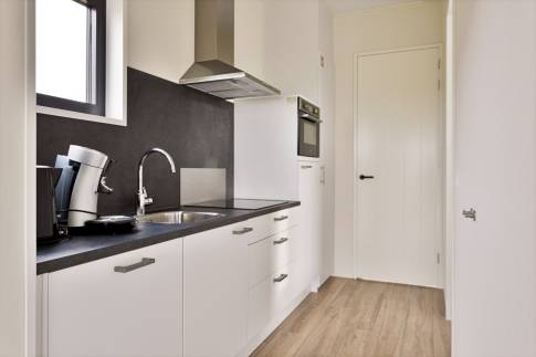 U komt de lichte woning binnen in de tuinkamer met een open inbouwkeuken. De keuken is uitgerust met een inductie kookplaat, afzuigkap, koelkast en vaatwasmachine.