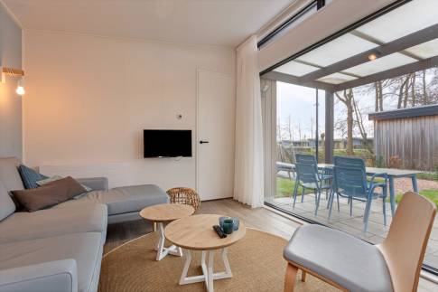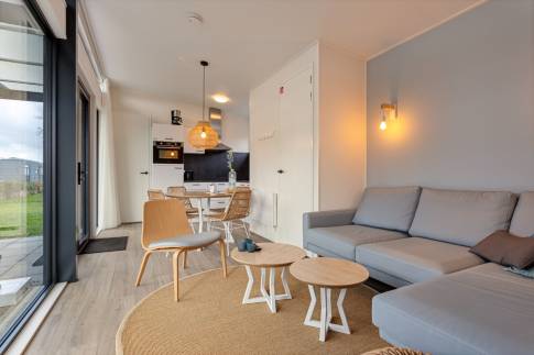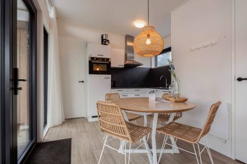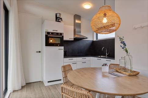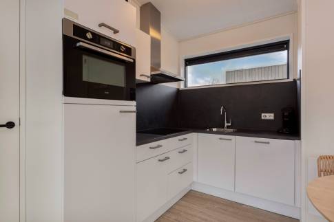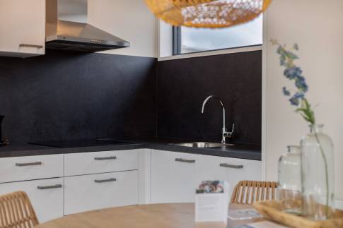 U komt de lichte woning binnen in de tuinkamer met een open inbouwkeuken. De keuken is uitgerust met een inductie kookplaat, afzuigkap, koelkast en vaatwasmachine.