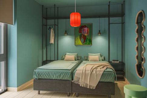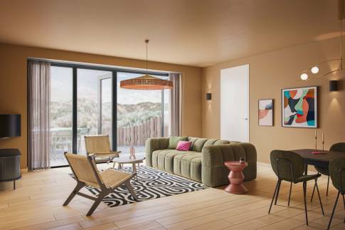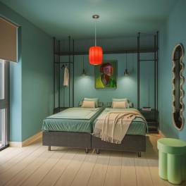 Bij binnenkomst tref je een ruime, lichte woonkamer met een open keuken, waar je gezellig kunt samenzijn. Aan beide zijden van de woonkamer liggen de twee comfortabele tweepersoonsslaapkamers. Achterin de suite vind je de moderne badkamer met inloopdouche en een separaat toilet. De stijlvolle inrichting en het gebruik van eigentijdse kleuren versterken het gevoel van luxe en ontspanning, wat bijdraagt aan een onvergetelijke beleving.