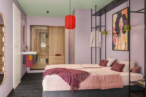 Het hart van de suite is de royale woon- en eetkamer, die naadloos overgaat in een luxe open keuken met kookeiland, perfect voor culinaire momenten. Beide ruime tweepersoons slaapkamers zijn uitgerust met een ensuite badkamer, voorzien van een eigen inloopdouche, wastafel en toilet, zodat iedere gast zijn of haar privacy volledig kan behouden. Om het ultieme ontspanningsgevoel te versterken, vind je in een badkamer een sauna, en in de andere een ligbad.