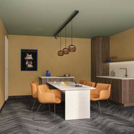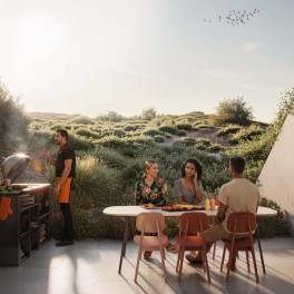 Op de souterrain opent zich een wereld van luxe en ruimte. Hier bevindt zich een royale open keuken met eetruimte, die via een grote glazen pui direct verbonden is met een beschut terras, omsloten door drie zijden van de villa. Het duin zelf vormt de vierde gevel, waardoor een intieme patio ontstaat met een stijlvolle buitenkeuken . Perfect voor lange, ontspannen avonden.