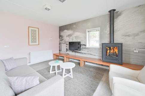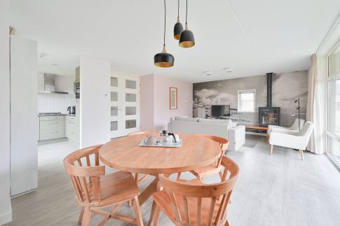 De woonkamer is licht en biedt voldoende ruimte om samen te ontspannen met een zithoek, flatscreen-tv, houtkachel en een gezellige sfeer, mede dankzij de stijlvolle afwerking. De open en moderne keuken is voorzien van alle nodige inbouwapparatuur.