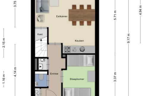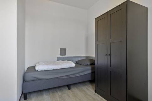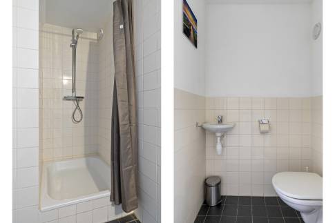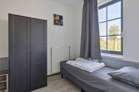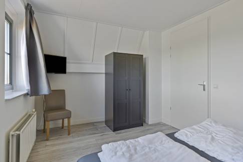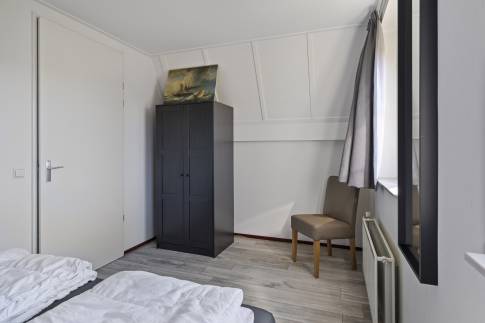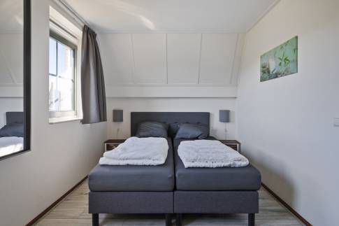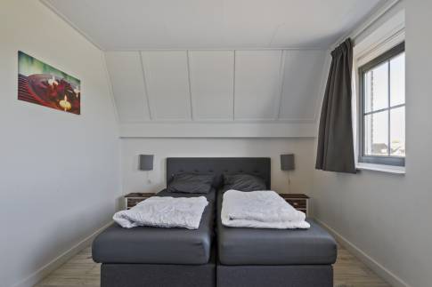 Op de begane grond bevindt zich tevens een slaapkamer met twee losse boxsprings, nachtkastjes en kastruimte, een separaat toilet en een handige bergkast.