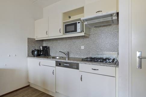 Via de entree betreedt u de sfeervolle woonkamer met trapkast en openslaande deuren naar de zonnige tuin. De open keuken is compleet uitgerust met een gasfornuis, koelkast met vriesvak, magnetron en vaatwasser.