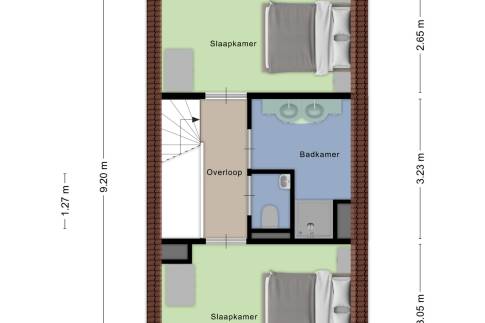 De verdieping biedt nog twee slaapkamers, beide voorzien van twee boxsprings, nachtkastjes en kastruimte, waarvan één met een flatscreen tv. De moderne badkamer beschikt over een douche, dubbele wastafel en een tweede separaat toilet.