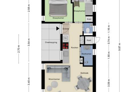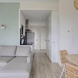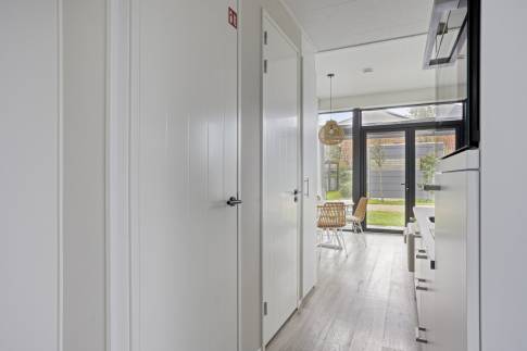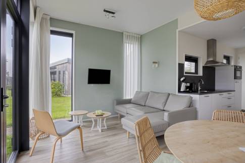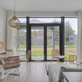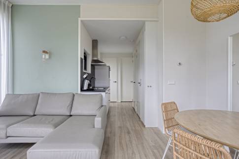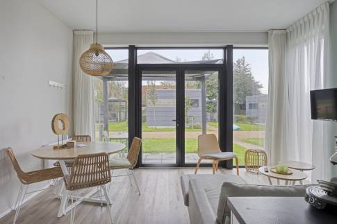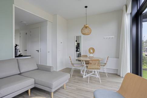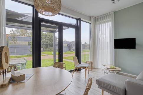 Van binnen word je verwelkomd door een lichte, sfeervolle woonkamer met grote ramen die het buitengevoel naar binnen halen. De zithoek met comfortabele bank en smart-tv vormt het hart van de woning. Via de openslaande deuren stap je zo het terras op, perfect voor ontbijt in de zon of een ontspannen avond in de buitenlucht.