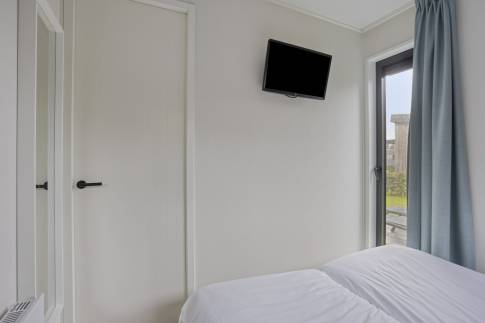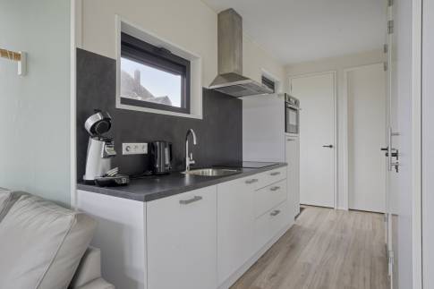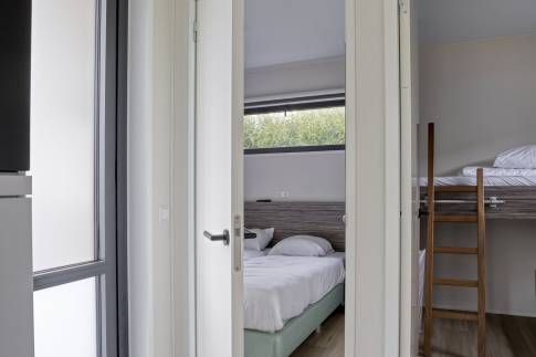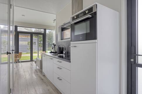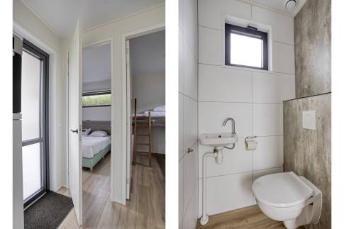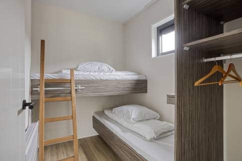 De open keuken is compleet ingericht met moderne inbouwapparatuur, waaronder een combimagnetron, koelkast met vriesvak, vaatwasser, koffiepadmachine en waterkoker. De lodge beschikt over twee slaapkamers, waarvan één met twee aparte bedden en één met een stapelbed, ideaal voor gezinnen met kinderen. De nette badkamer heeft een douche en wastafel, en er is een separaat toilet aanwezig.
