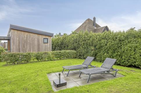 Buiten geniet je van een ruim terras met tuinmeubilair en uitzicht over het groen, de ideale plek om even helemaal tot rust te komen.