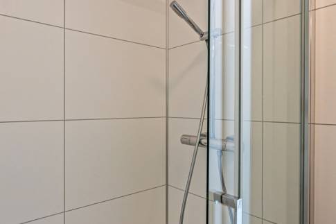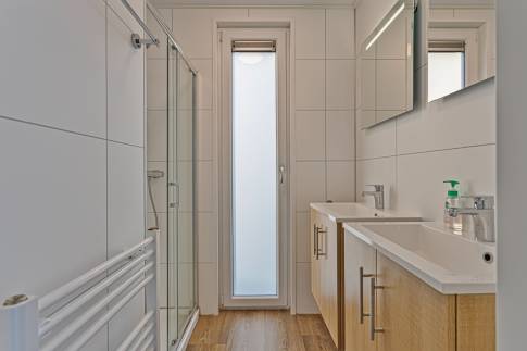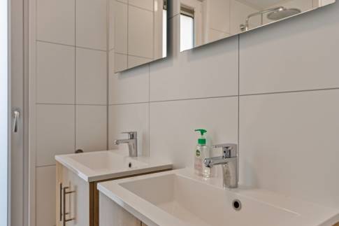De badkamer is voorzien van een wastafel met meubel, spiegel en een douche-inrichting met thermostatische mengkraan. Gelegen op eigen grond.