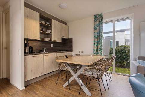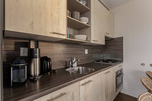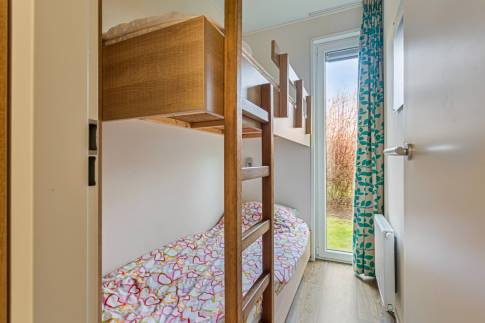 Entree, toilet met fonteintje, woonkamer met open keuken inclusief 4 kookpits gaskomfoor, afzuigkap, koelkast, oven en vaatwasmachine, 3 slaapkamers waarvan er één met een stapelbed.