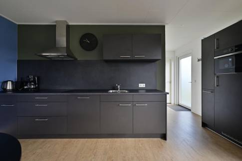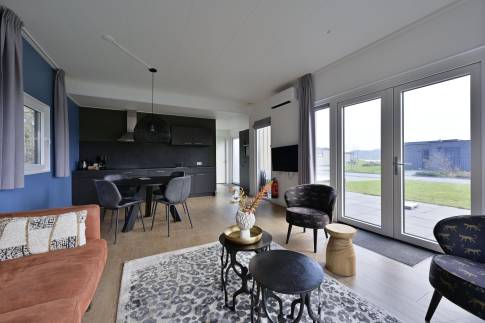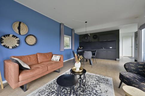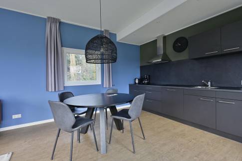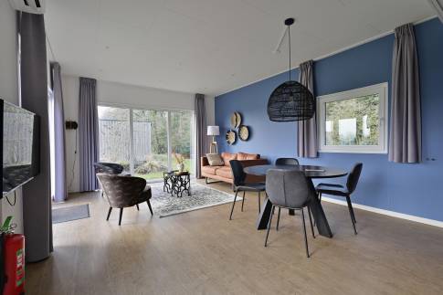 De sfeervolle woon-/eetkamer is ingericht met een gezellige zithoek, een eethoek en een flatscreen-tv. De open keuken is volledig uitgerust met moderne voorzieningen zoals een 5-pits inductiekookplaat, combimagnetron, vaatwasser, koelkast met vriesvak en een Nespresso koffiemachine. Buiten biedt een ruim terras met tuintafel en stoelen de ideale plek om te genieten van de rust.