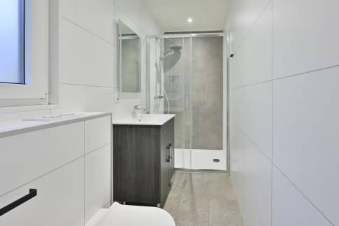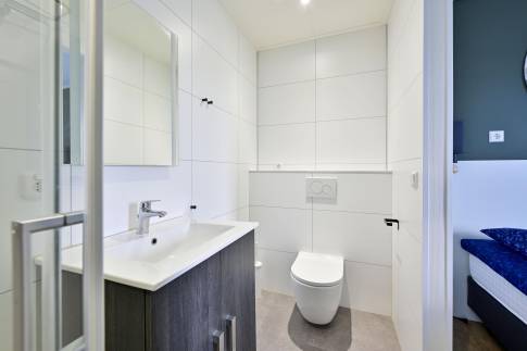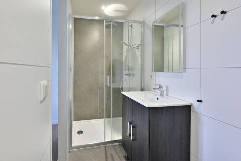 De woning beschikt over twee ruime slaapkamers, elk met een comfortabel 2-persoonsbed inclusief dekbedden en hoofdkussens. Beide slaapkamers hebben een eigen en suite badkamer met een luxe rainshower, wastafel en toilet, wat zorgt voor extra privacy en gemak.