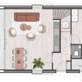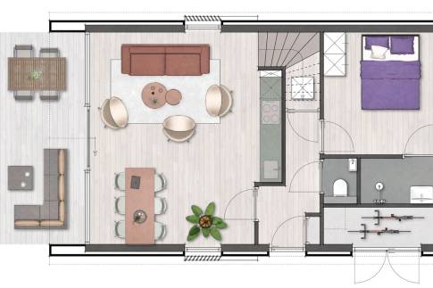 Begane grond: hal/entree, separaat toilet, woonkamer met schuifpui naar terras en tuin, open keuken voorzien van alle hedendaagse inbouwapparatuur, slaapkamers met badkamer ‘en suite’ voorzien van wastafel en douche, van buitenaf toegankelijke berging.