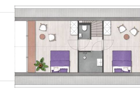 Verdieping: twee slaapkamers, separaat toilet en badkamer voorzien van douche en wastafel.