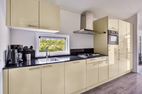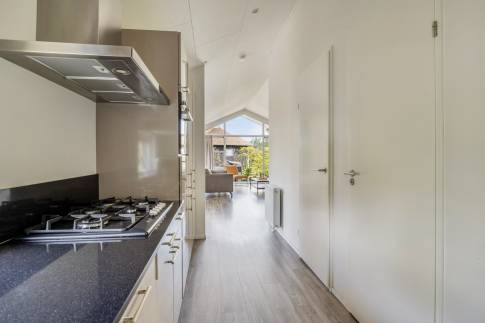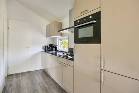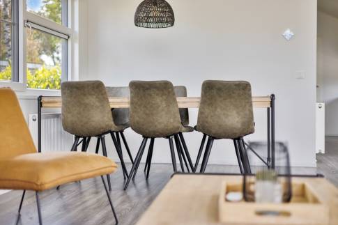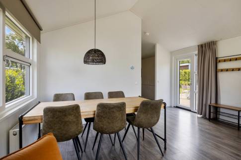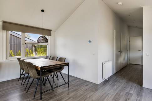 De ruimte eethoek biedt voldoende ruimte om met 6 personen te borrelen of te eten. De halfopen keuken biedt alle comfort die je nodig hebt om een heerlijke maaltijd te bereiden. En heb je geen zin om te koken, dan loop je via het bruggetje in enkele minuten naar het restaurant met een uitstekende keuken. In de zomer kun je er op het terras aan het water lunchen of dineren.