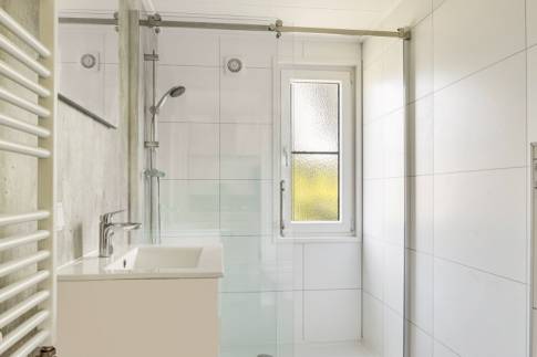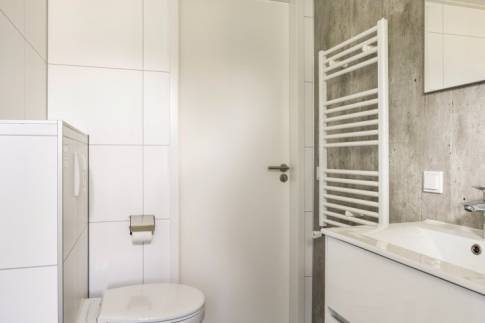 In de moderne, luxe badkamer vind je een wastafelmeubel, inloopdouche en het toilet.