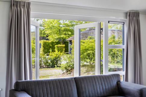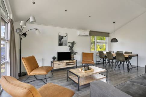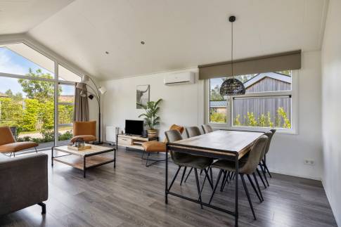Je komt binnen in de riante woonkamer, die sfeervol is ingericht met een gezellige zithoek met grote ramen, die veel licht binnen laten. In de zomer zorgt de airco voor een aangenaam binnenklimaat en in de winter wordt het snel warm door de centrale verwarming.